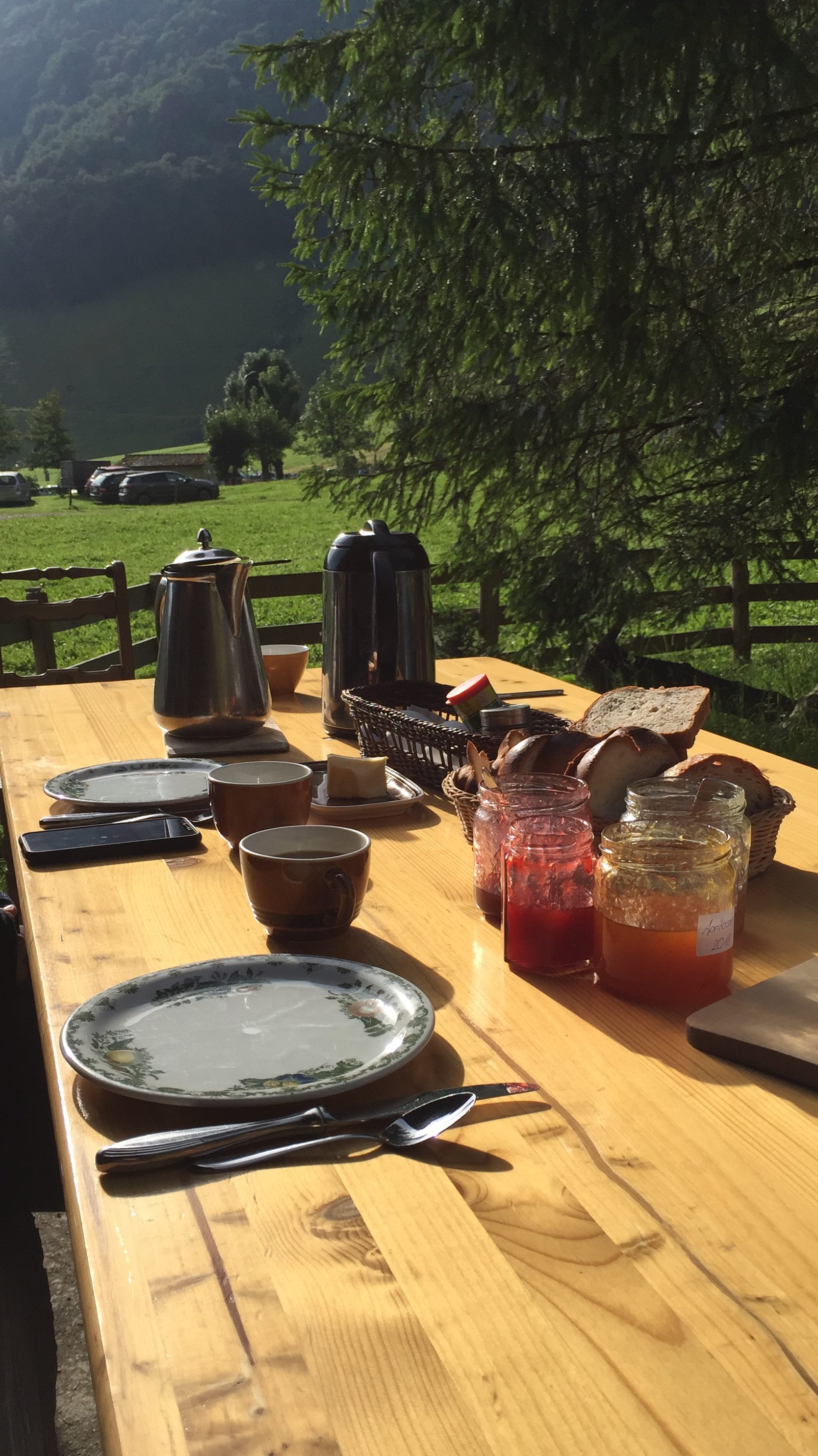 Os dois não falam quase nada de inglês, mas o suficiente para fazermos muitas mímicas e garantir boas risadas ontem à noite! Ruth nos contou que a fazenda só funciona entre Março e Outubro, pois durante os meses mais frios, o sol simplesmente não aparece, pois fica escondido por trás dos enormes alpes que a cercam.
