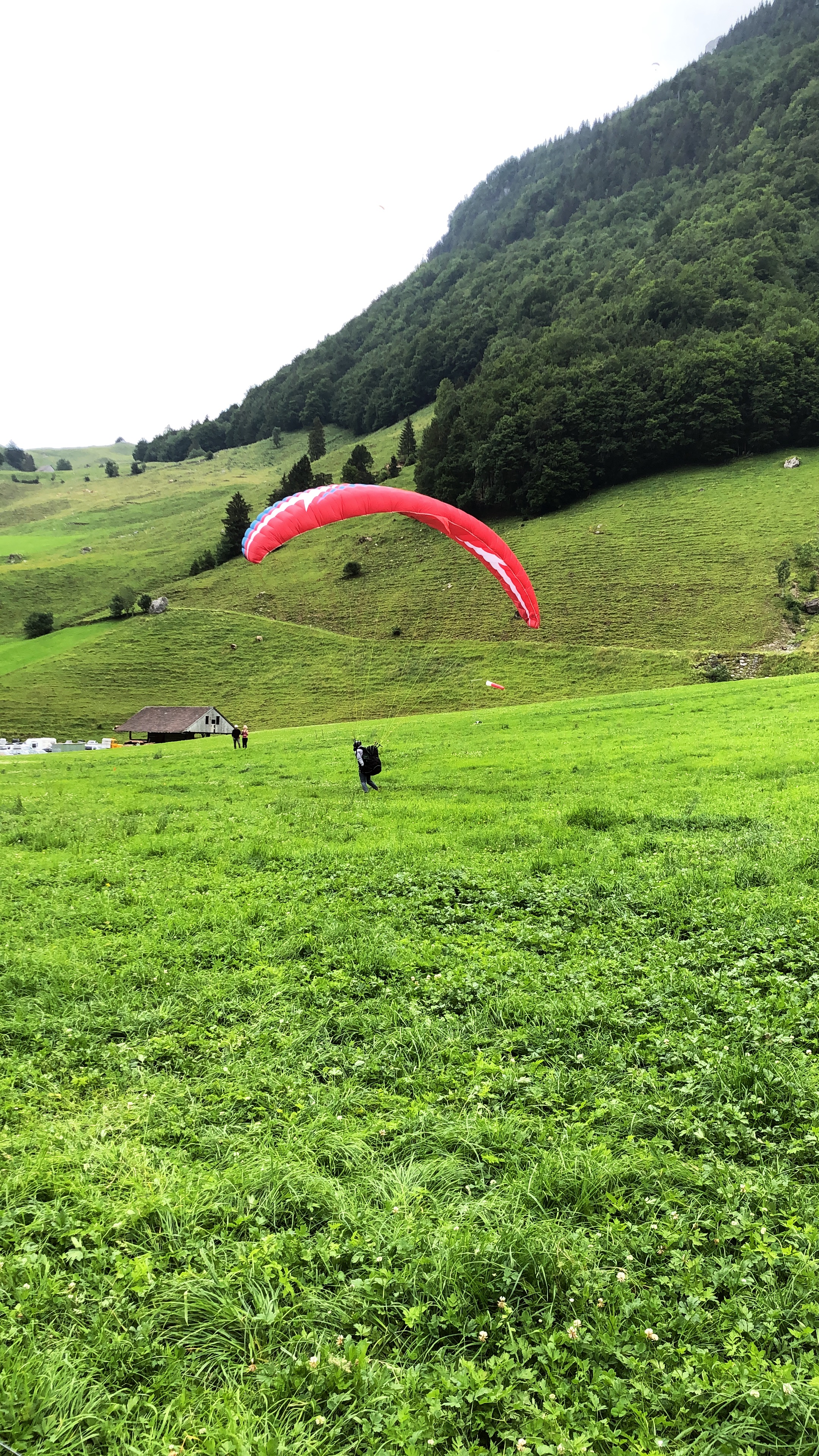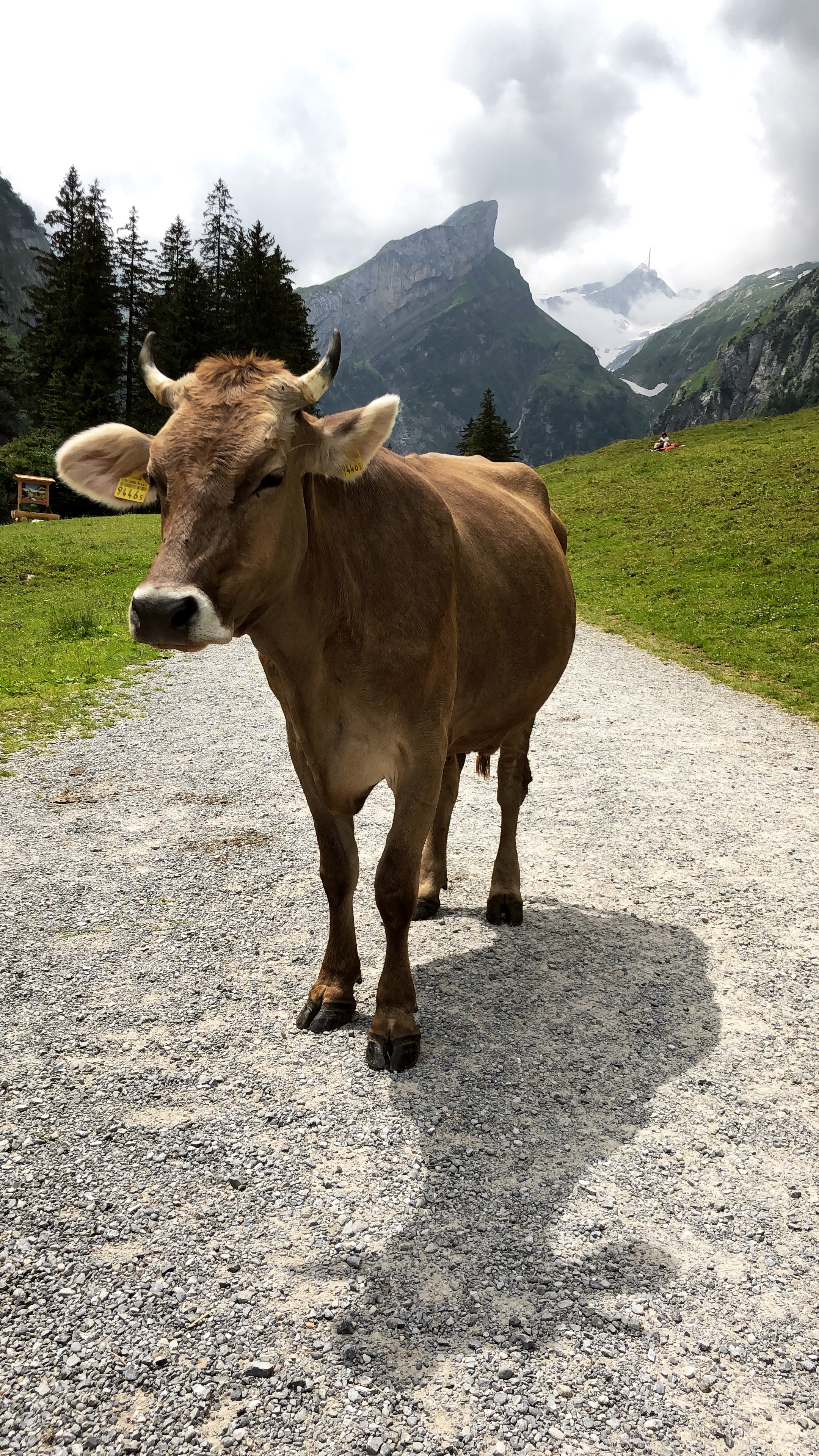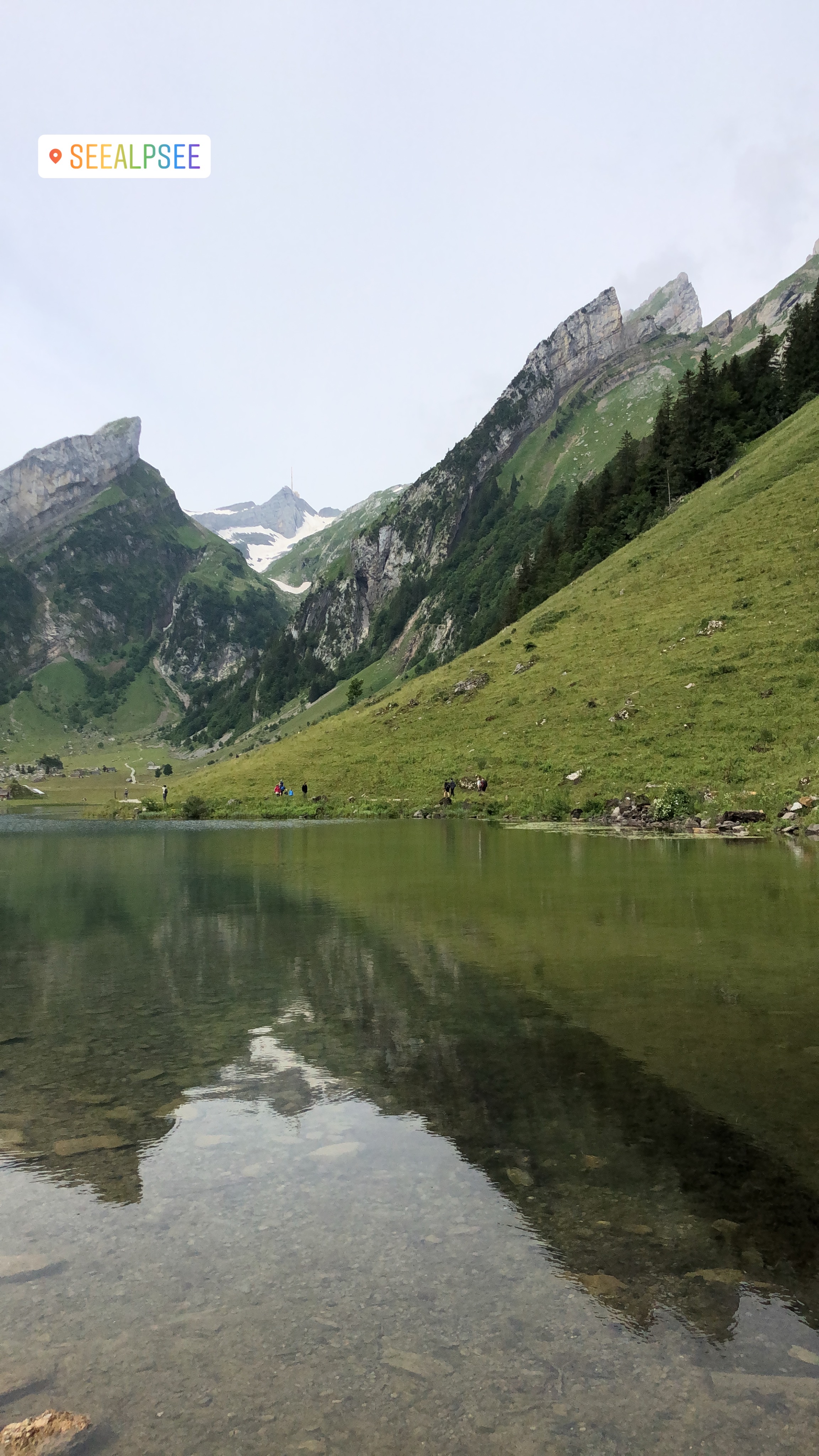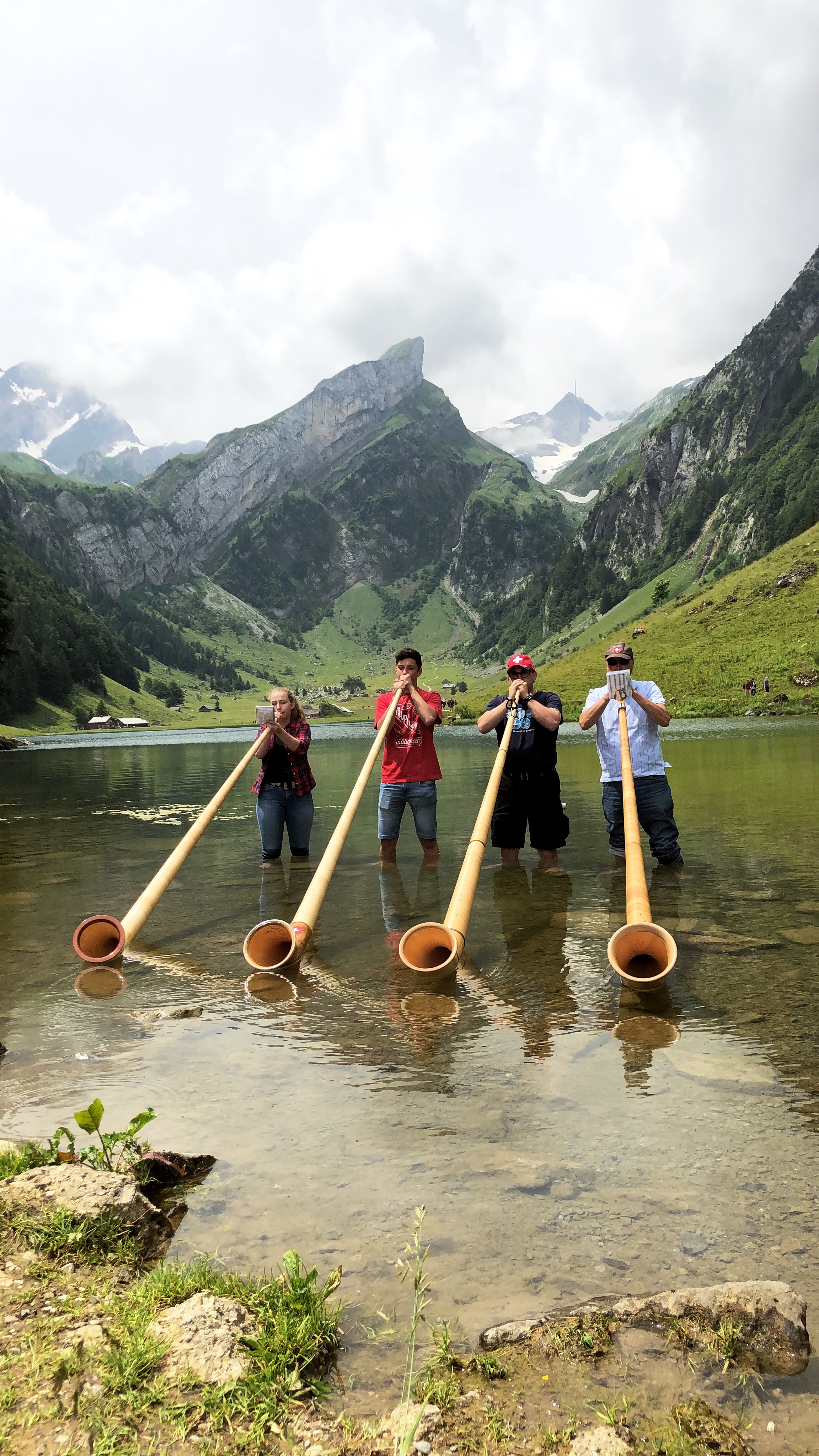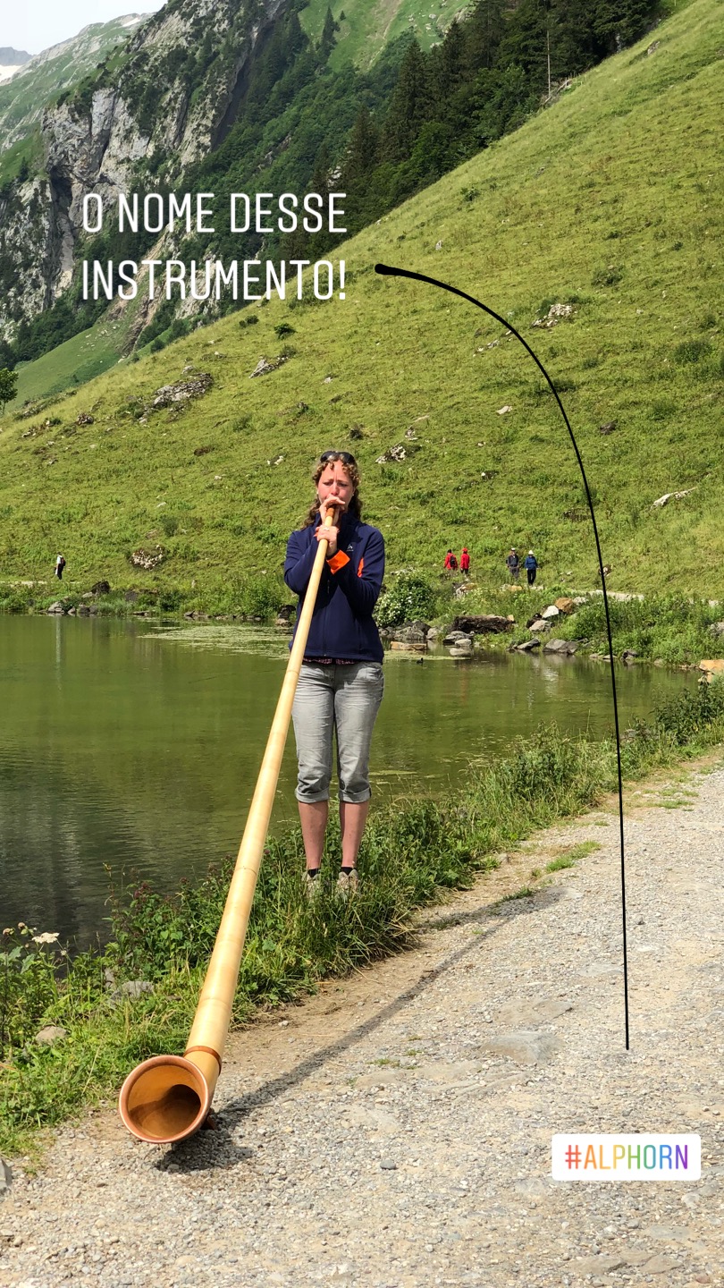 Em seguida, tivemos uma verdadeira experiência cultural Suíça ao descobrirmos que, ao lado da fazenda, teria um festival de Alphorn, um instrumento musical que lembra um trompete, tocado pelos locais ao lado do lago Seealpsee. Subimos até o lago, 1 hora de caminhada, assistimos ao festival, almoçamos salsicha com pão, no estilo alemão. Ao redor do lago, as típicas vaquinhas suíças pastando livremente e o céu cheio de paraquedistas.