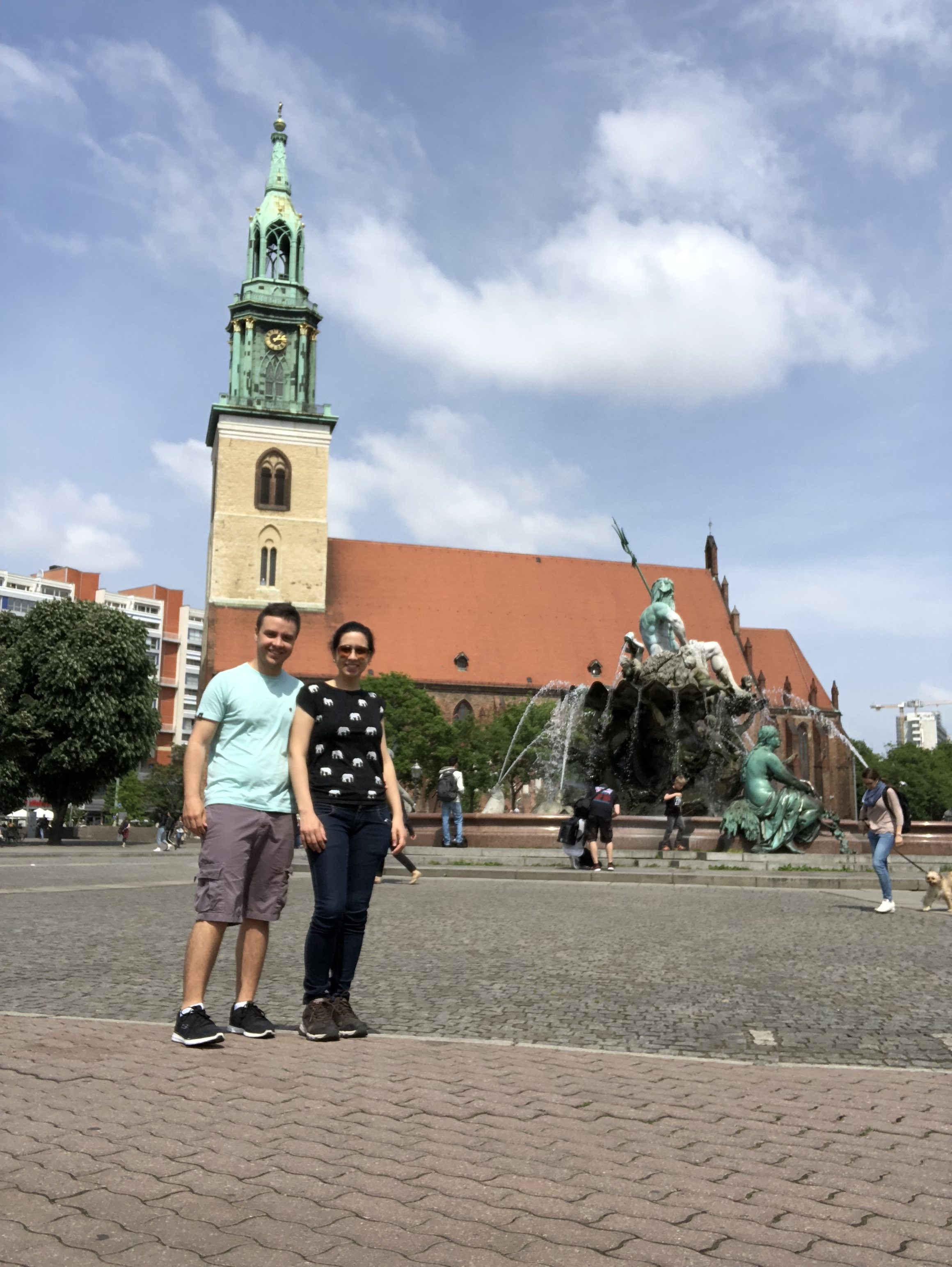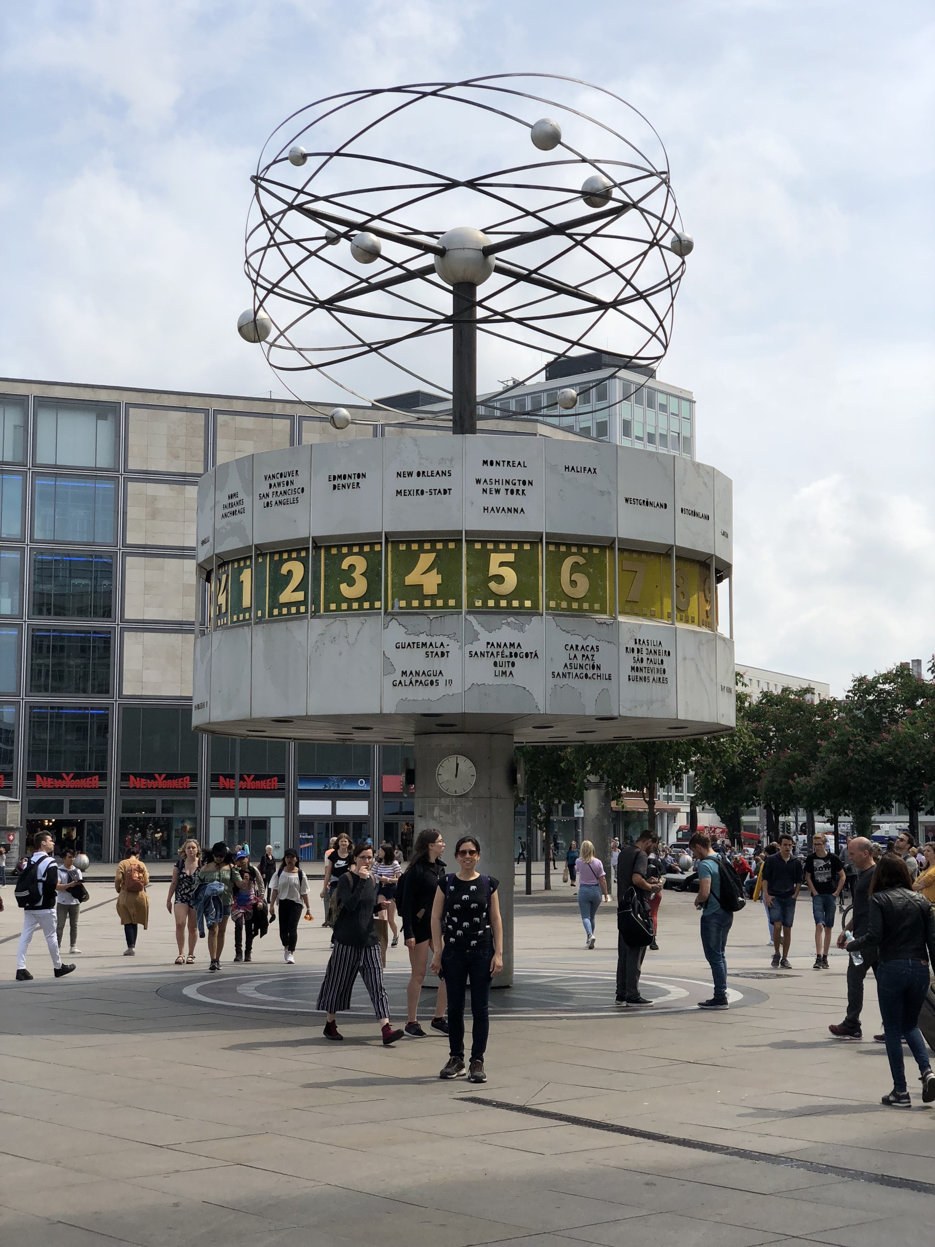 Dia 01– Começamos nosso dia pela Alexanderplatz, praça principal do centro de Berlim, lá tem um relógio gigante que mostra as horas das principais capitais do mundo. Tem uma fonte no meio, perto dos principais pontos turísticos. Lá fica a Torre da TV, que também é um ponto turístico, você pode subir para apreciar a vista da cidade.