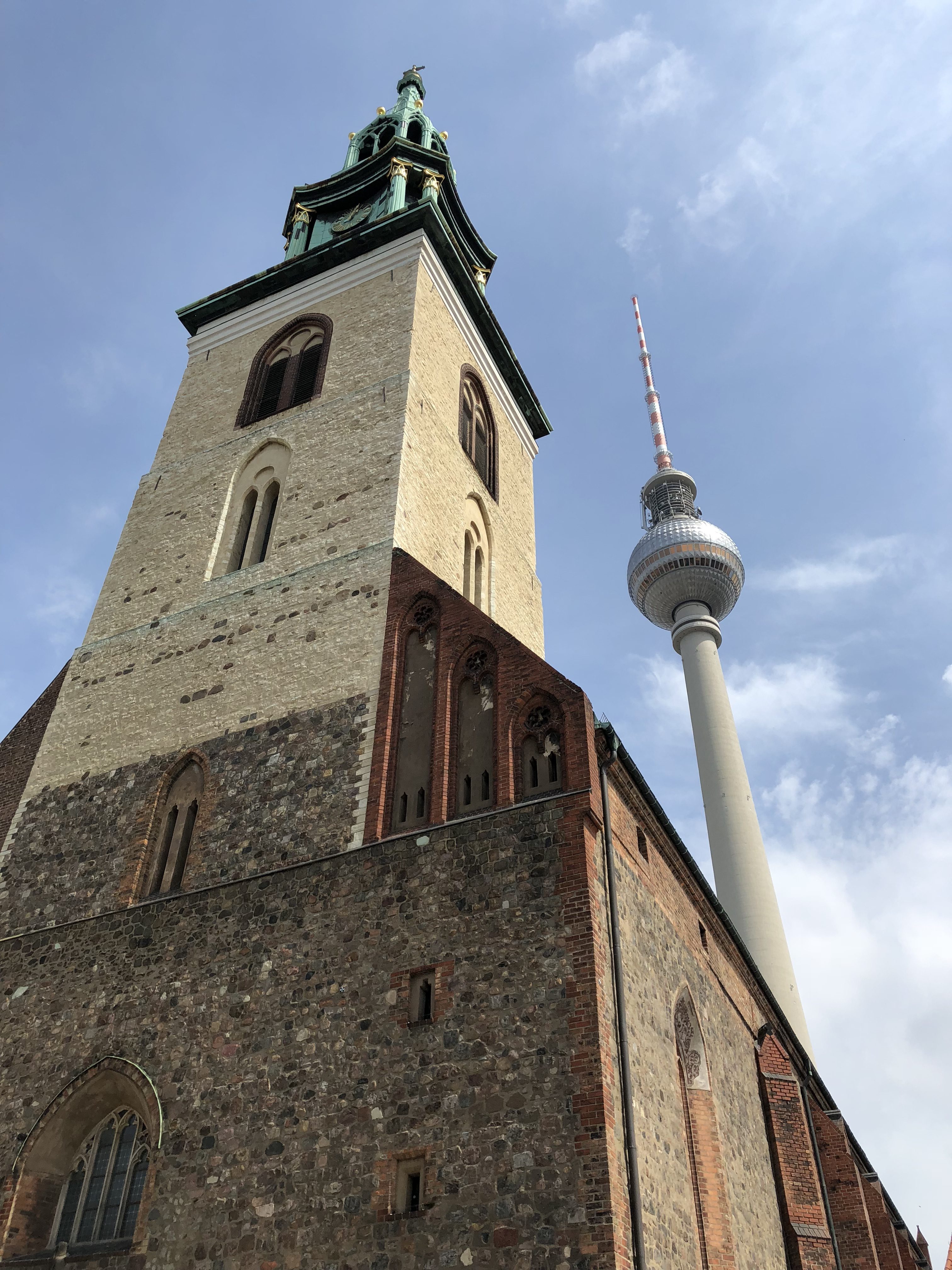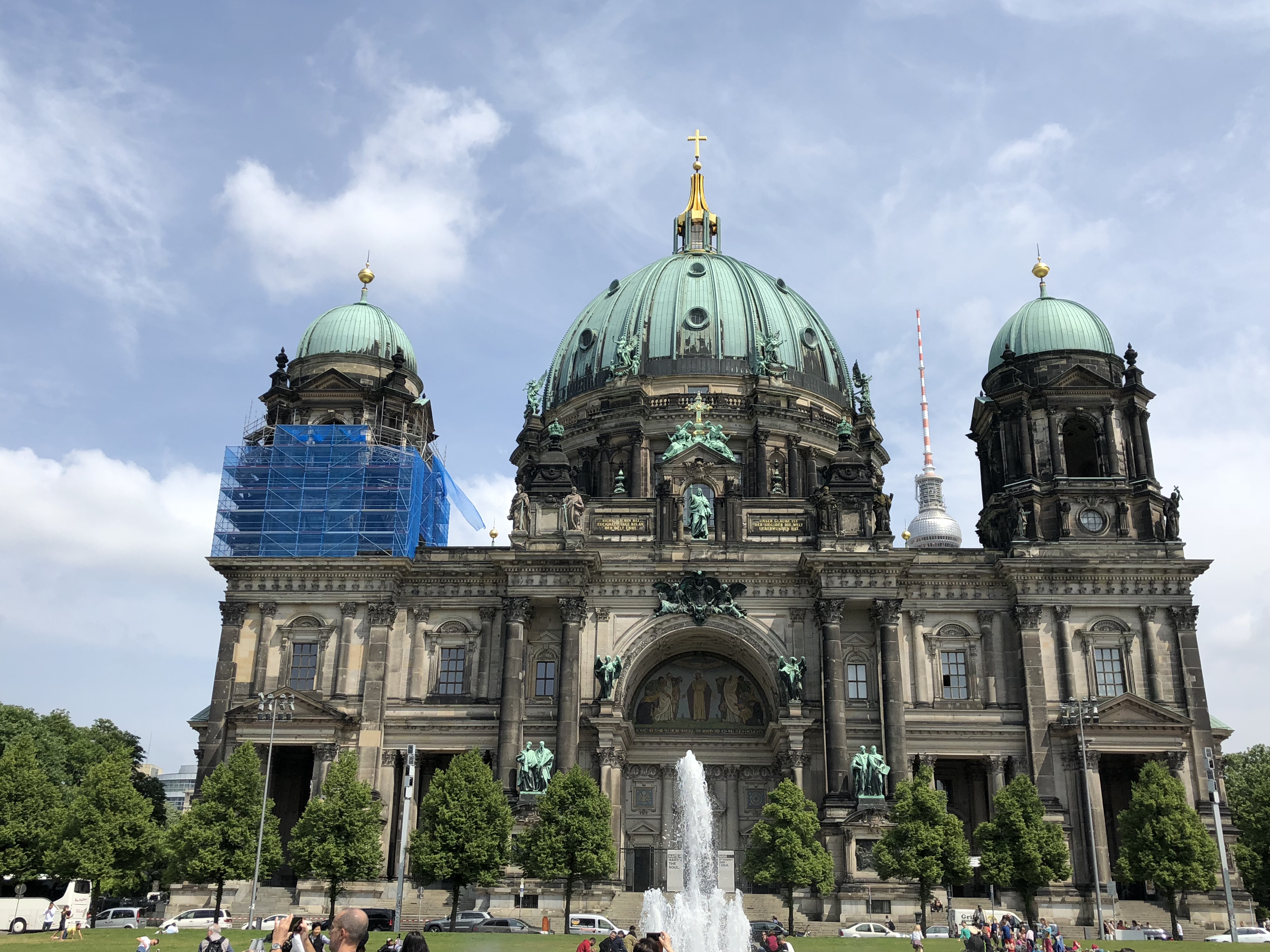Seguimos caminhando, passamos pela igreja St. Marienkirshe, que parecia muito ser uma igreja católica, mas ao entrar descobrimos que era evangélica. Na frente dessa igreja fica a Fonte de Netuno. Continuamos até a Berliner Dom, a catedral de Berlin, que também é evangélica. Nessa área tem alguns museus ao lado.
