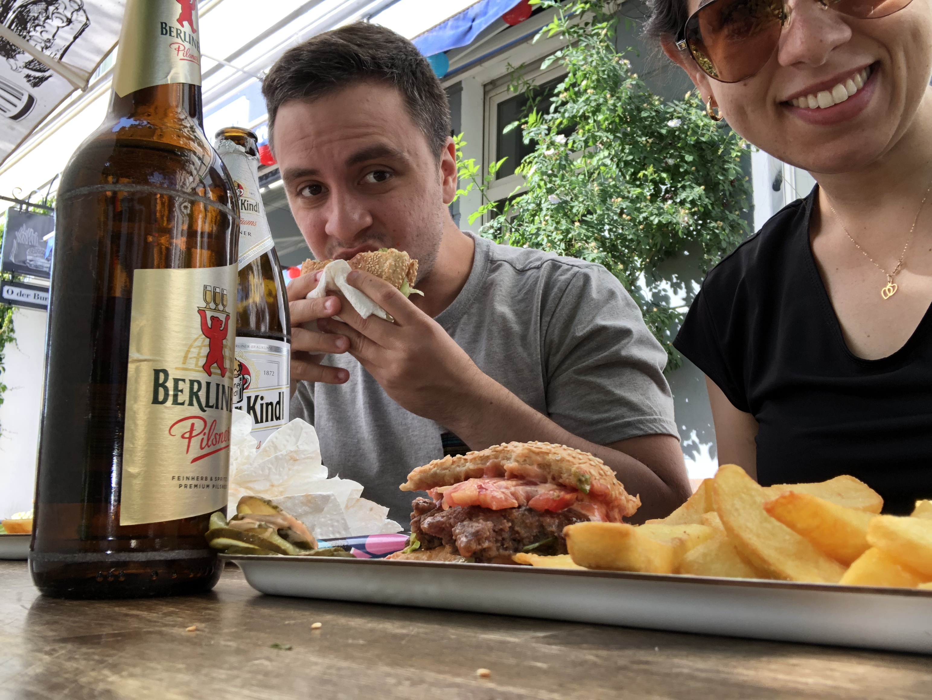 Depois fomos ao Mauerpark – em direção ao parque tem uma rua chamada Bernauer St. que tem quase um museu ao céu aberto, a rua toda tem resquícios do muro e com informações sobre o que aconteceu no local na época da guerra fria e depois fomos a Eberswalder Str./ Oderberger Str., uma rua com muitas atrações culinárias, comemos um hamburgão no O Der Burger.