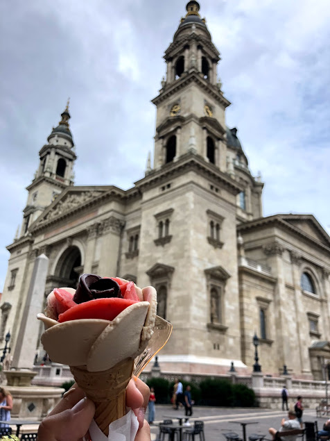 Sorvete em formato de rosa na Gelarto Rosa. Essa sorveteria fica ao lado da Basílica de Santo Estêvão, vale a pena a visita a igreja, seguida de um sorvetinho, viu!