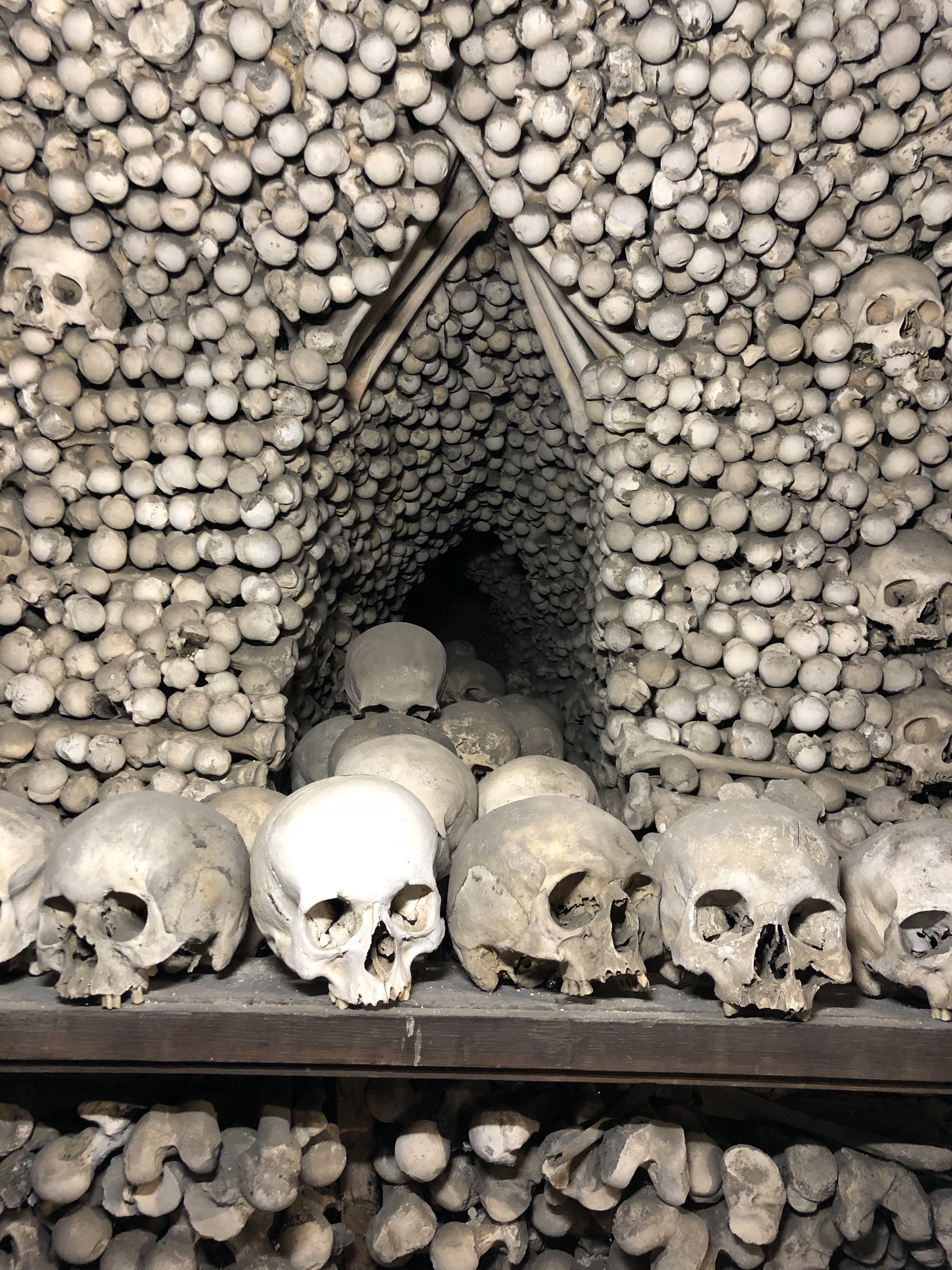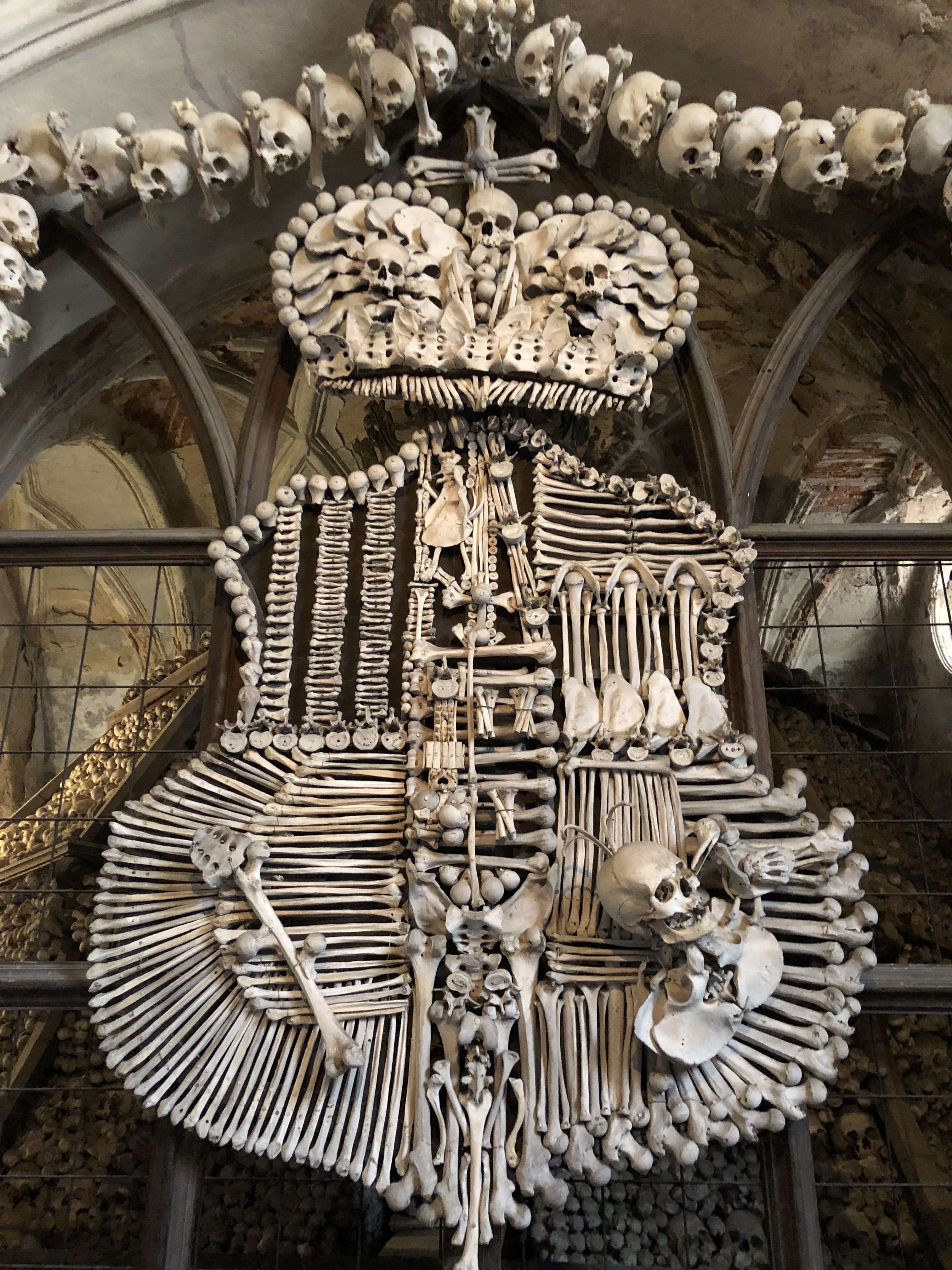 Dia 03 – Compramos o ticket do trem na estação central para a cidade de Kutná Hora, ida e volta para dois custou R$ 60,00. Chegando na estação de Kutná Hora fomos caminhando até a famosa igreja de ossos. Pagamos 2.50 euros/cada para entrar. A igreja é bem pequena. No começo achei meio maluca a coisa, meio assustadora. Algo diferente a ser visto, que apesar de esquisito, ao final passa uma mensagem bem importante: Após a morte, somos todos iguais perante Deus.
