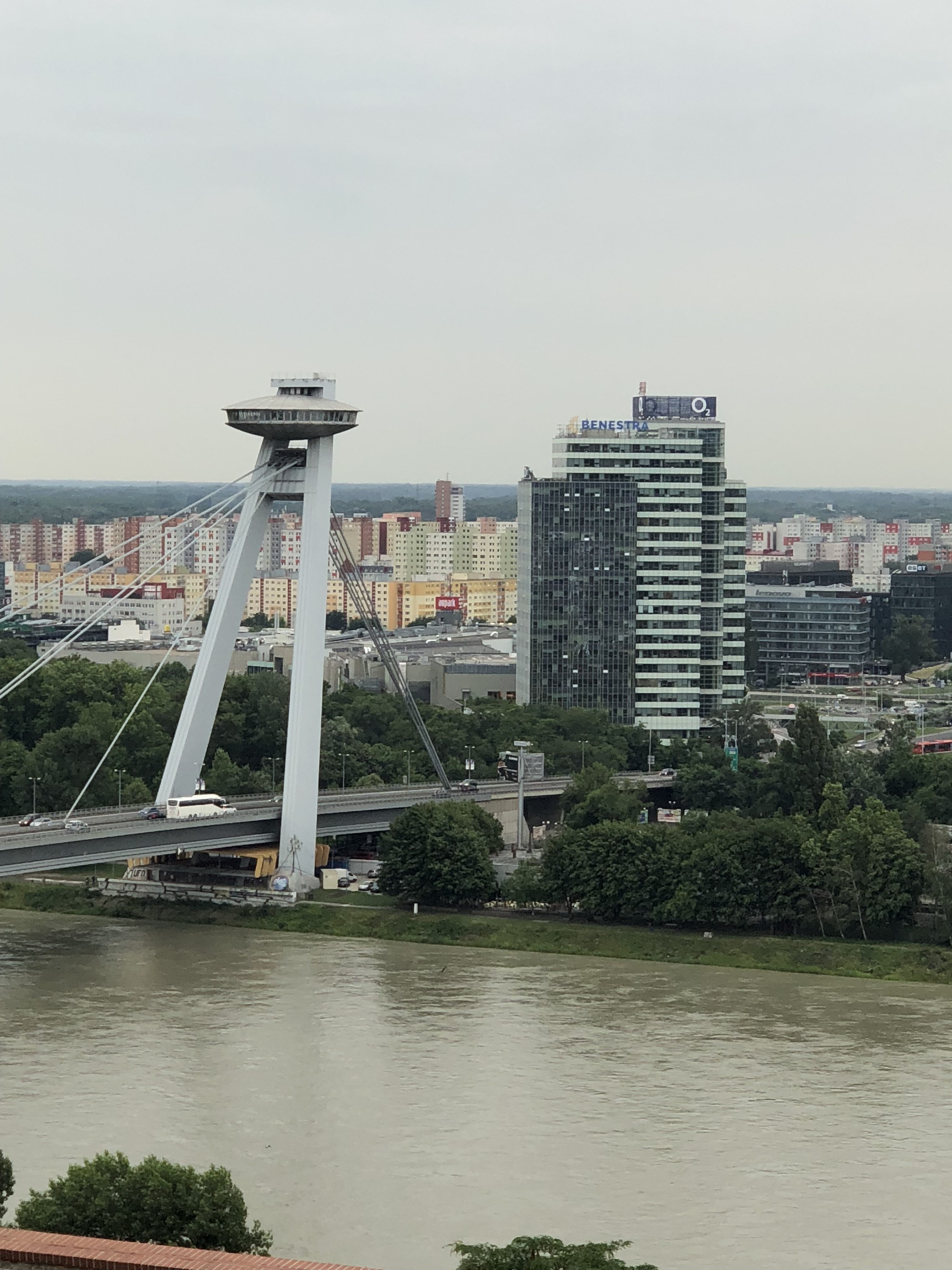 - Visite o Castelo de Bratislava, que fica no topo da cidade e dá para ter uma vista legal da cidade. Tá vendo essa ponte, essa estrutura é conhecida como UFO, também é possível subir, lá em cima tem um restaurante.