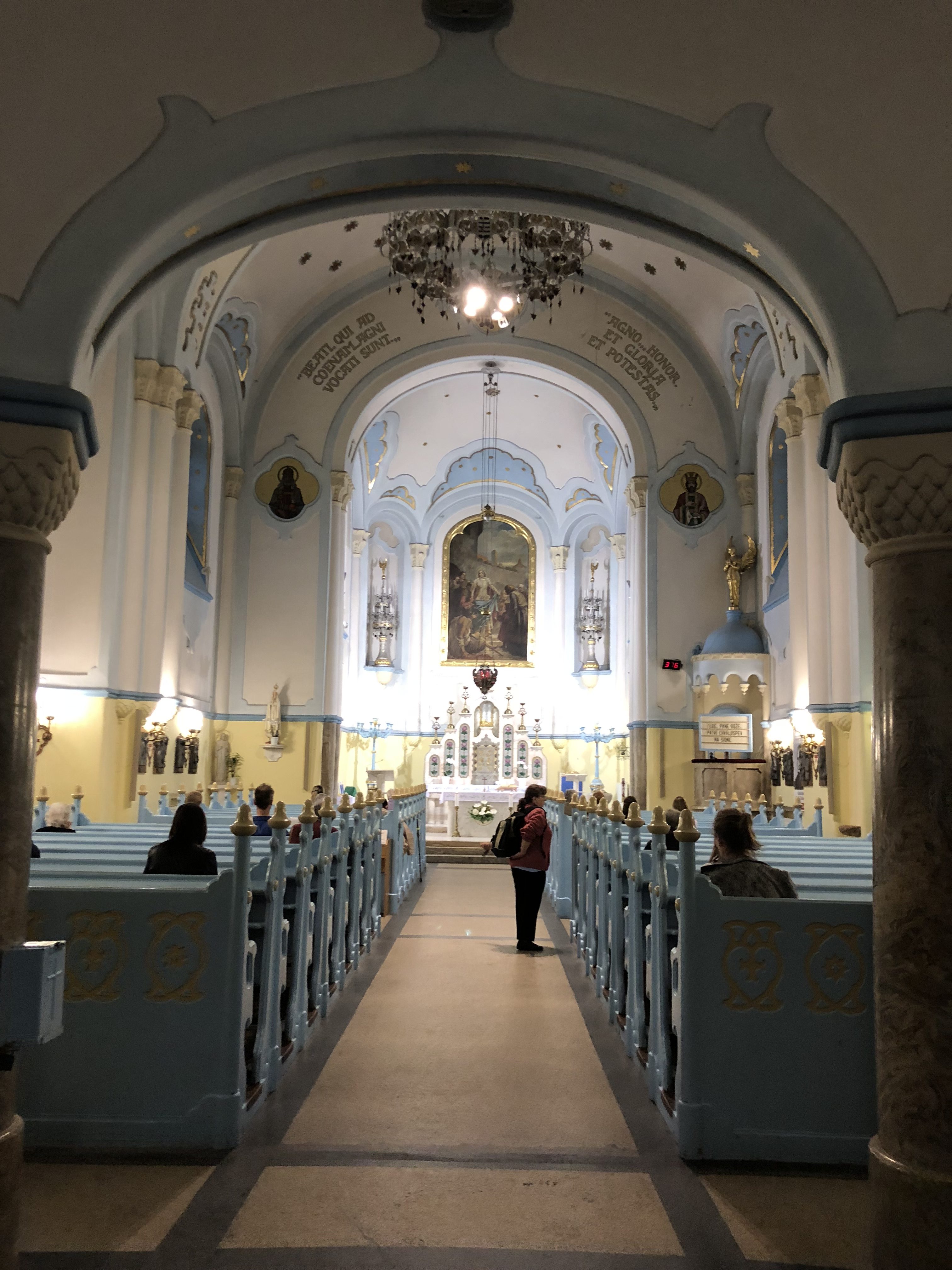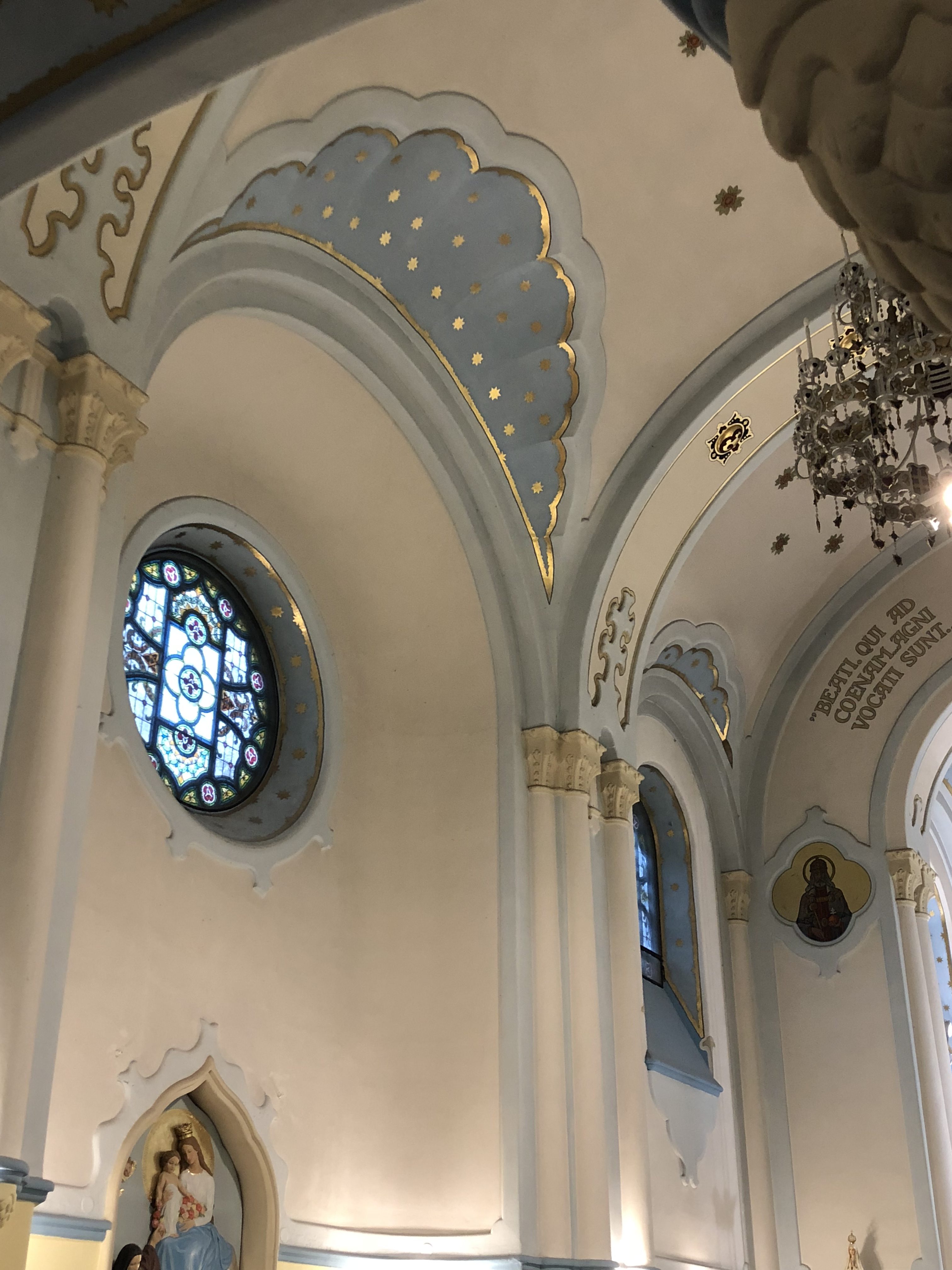 A igreja é muito delicada, quando você entra parece que chegou no céu. A singeleza do azul claro torna tudo muito puro e simples. Diferente das igrejas mais visitadas da Europa, a simplicidade e harmonia, fazem com que eu considere a igreja mais linda que já visitei.